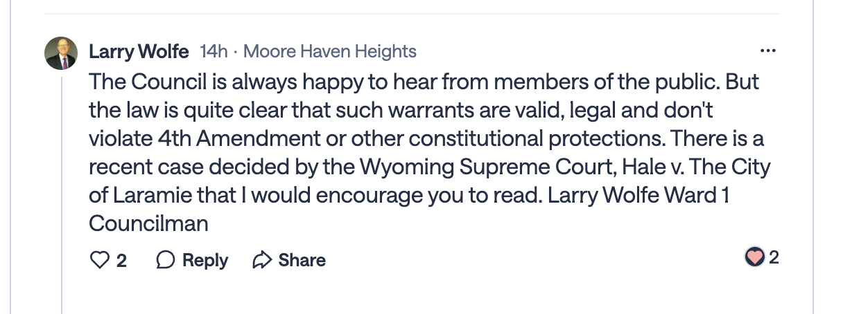 When citizens raised constitutional concerns on Nextdoor, Ward 1 Councilman Larry Wolfe responded: